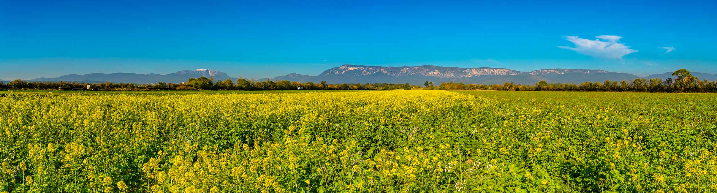 Herbstlich blühende Senfsaatfelder mit Blick zum Schneeberg und zur Hohen Wand. Links die Kirche von St. Egyden.