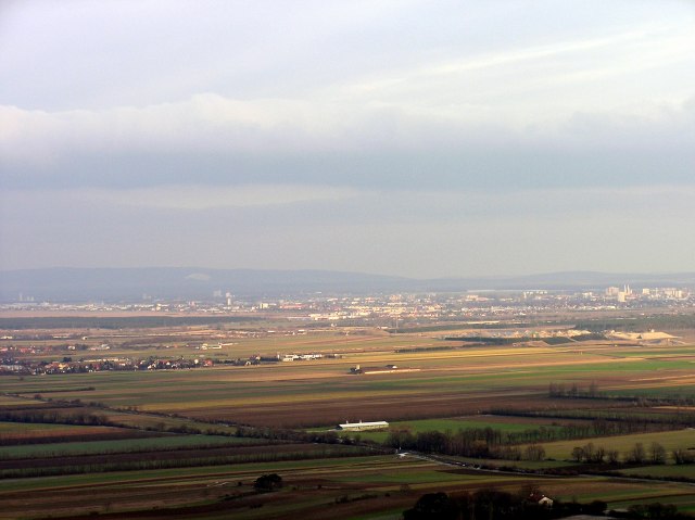 Zoom auf Wiener Neustadt, dahinter das Leithagebirge
