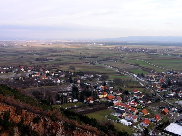 Blick über Winzendorf nach Osten; rechts hinten Weikersdorf, in der Ferne links hinten Wiener Neustadt