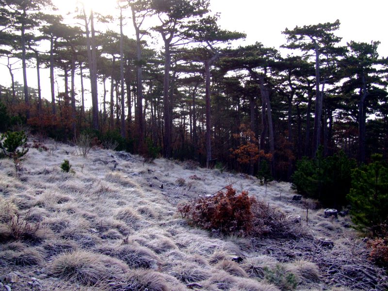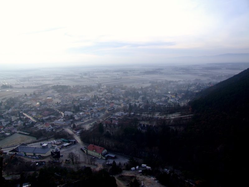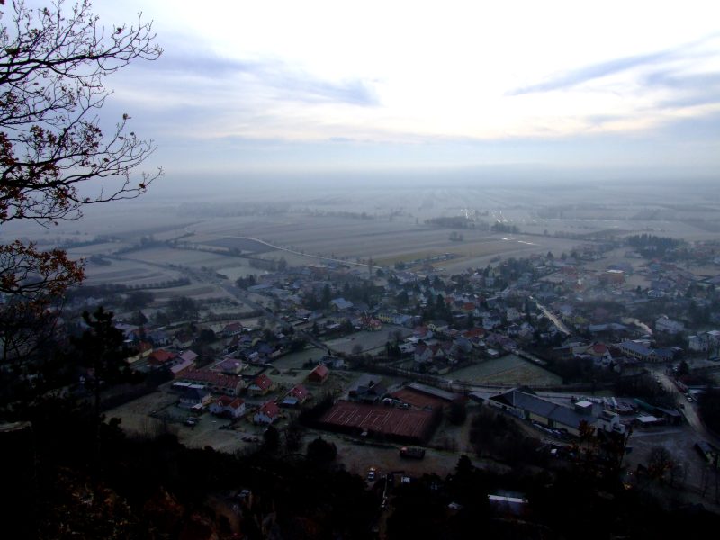 Heute habe ich in der Früh Zeit bis 10 Uhr, also muß ich zu einer kurzen Wanderung früh raus. Es ist etwas eisig, -1 Grad, und extrem diesig, aber Nebel herrscht zum Glück keiner mehr. Ich wandere von Winzendorf oberhalb des alten Kalksteinbruches auf den Schloßberg.
