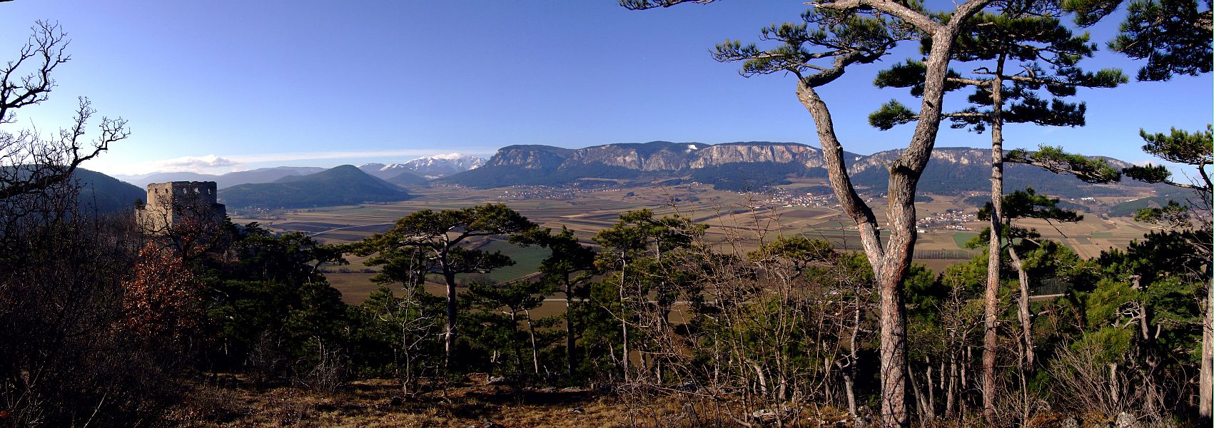 Panoramablick über die Ruine Emmerberg und die Neue Welt. Dieses Panorama wurde aus fünf stark überlappenden, im Hochformat (!) aufgenommenen Bildern mit Hilfe von Microsoft ICE ("Image Composite Editor") zusammengesetzt. ICE ist eine experimentelle Software im Stadium der Entwicklung und kann daher derzeit noch frei heruntergeladen werden. Wie man hier sieht, kann ich sie nur allerwärmstens empfehlen.