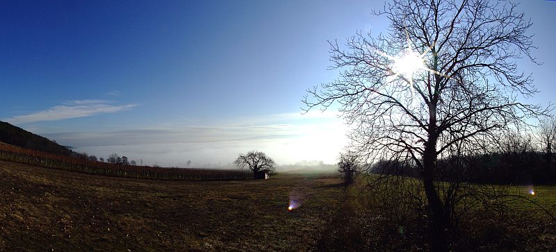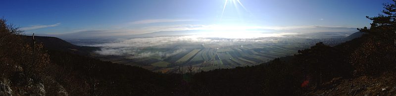 Panoramablick über das Nebelmeer bei Winzendorf. Ins Bild oder hierher klicken für eine größere Darstellung.