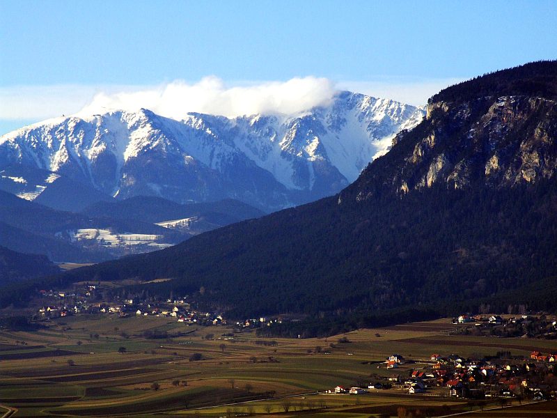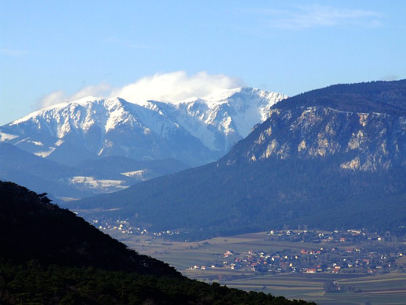 Ich habe am Gebirgszug die Seite gewechselt und stehe nun beim "Neue Welt - Blick". Eine föhnige Gipfelwolke hängt am Schneeberg.