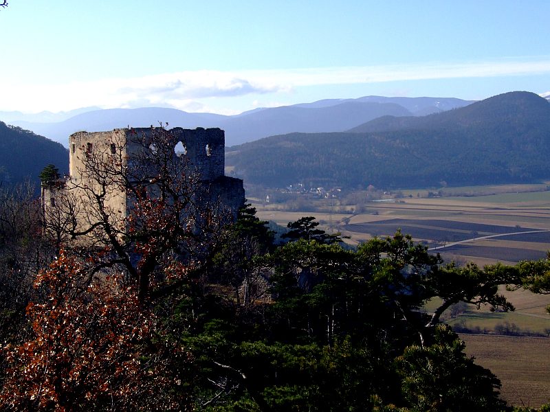 Panoramablick über die Ruine Emmerberg und die Neue Welt. Dieses Panorama wurde aus fünf stark überlappenden, im Hochformat (!) aufgenommenen Bildern mit Hilfe von Microsoft ICE ("Image Composite Editor") zusammengesetzt. ICE ist eine experimentelle Software im Stadium der Entwicklung und kann daher (derzeit noch) frei heruntergeladen werden. Wie man hier sieht, kann ich sie nur allerwärmstens empfehlen. Hierher oder ins Bild klicken für eine größere Darstellung.