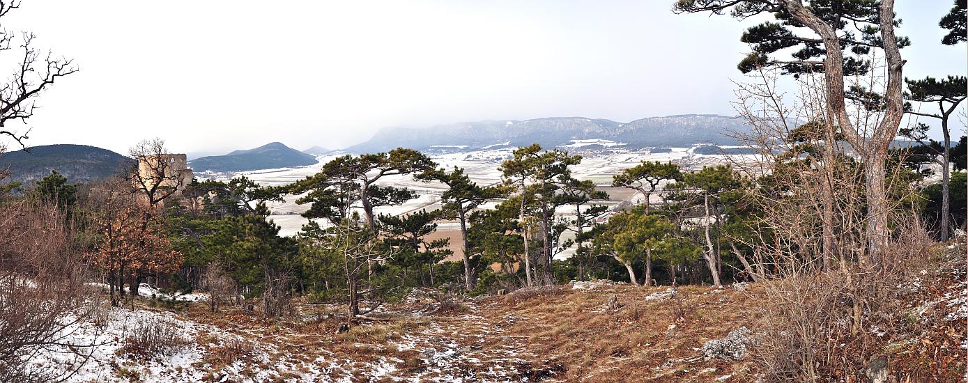 Panoramablick über die Ruine Emmerberg und die Neue Welt zur Hohen Wand. Der Schneeberg ist heute nicht sichtbar.