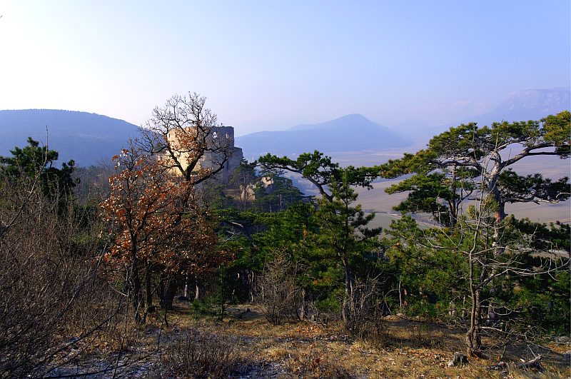 At the ruin Emmerberg, viewing to Kienberg, far right is Hohe Wand. Schneeberg to its left is barely seen in the extreme dust.