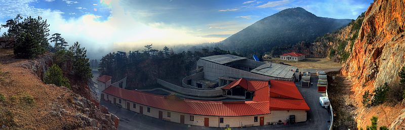 The mist ends at the large disused limestone quarry. A roof for Winzendorf´s Karl May festival area is under construction. Click here or into the picture for a larger version.