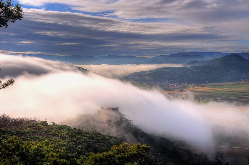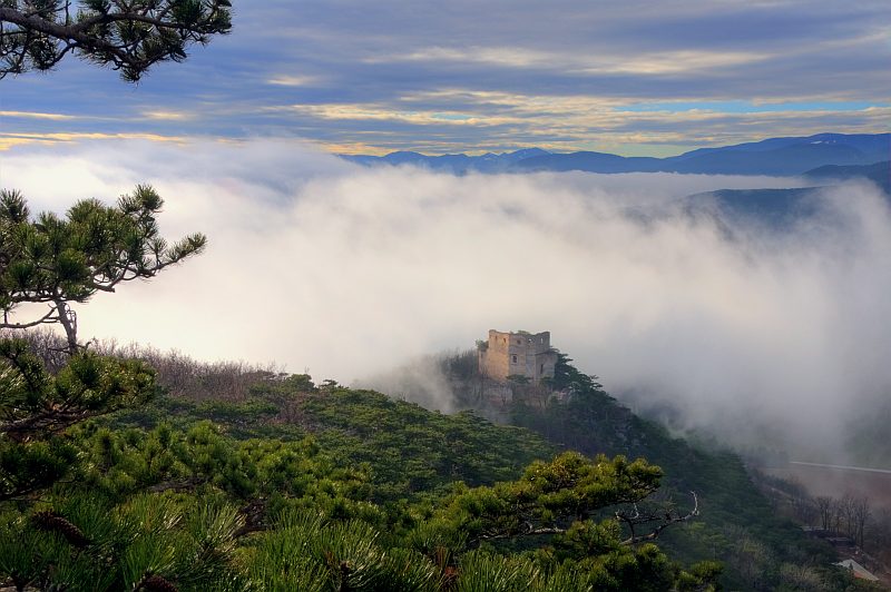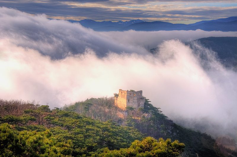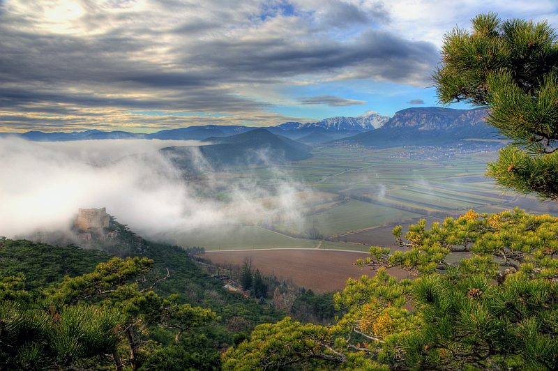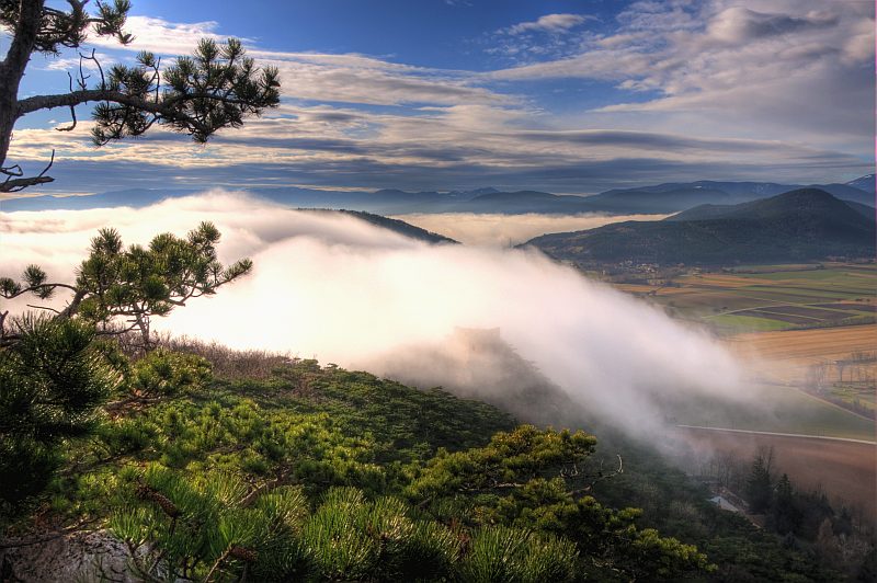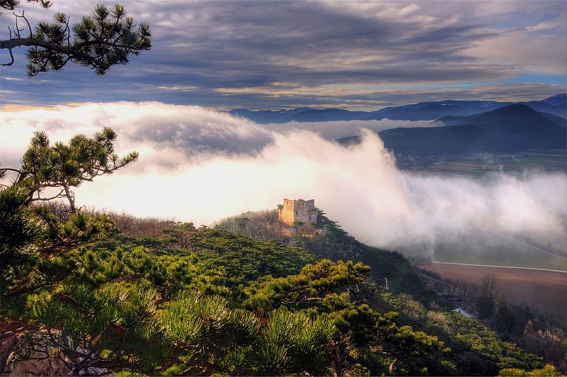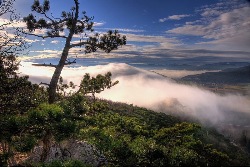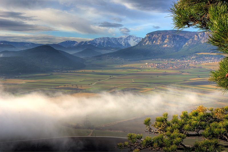 The further route leads me through the forest to the western escarpments of Schlossberg down to Neue Welt, near the summit. On the summit there is only poor view, but here I found a slightly inclined rock plateau of about 10 m2, above a 15 m escarpment, where I set up my tripod and meditate the stunning view, making pictures from time to time. To the left, behind the ruin of Emmerberg is the Semmering/Wechsel region, then Kienberg with Schneeberg behind, to the right is Hohe Wand. We are looking over the slightly inclined dale area of the "Neue Welt". I leave the visitor now alone with the pictures, which repeat in motive, but not in the fog situation.