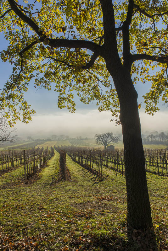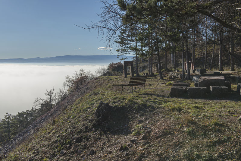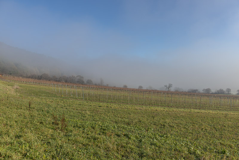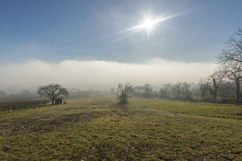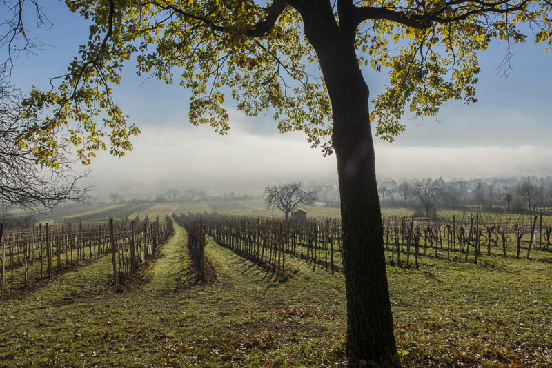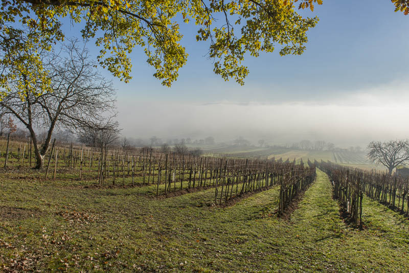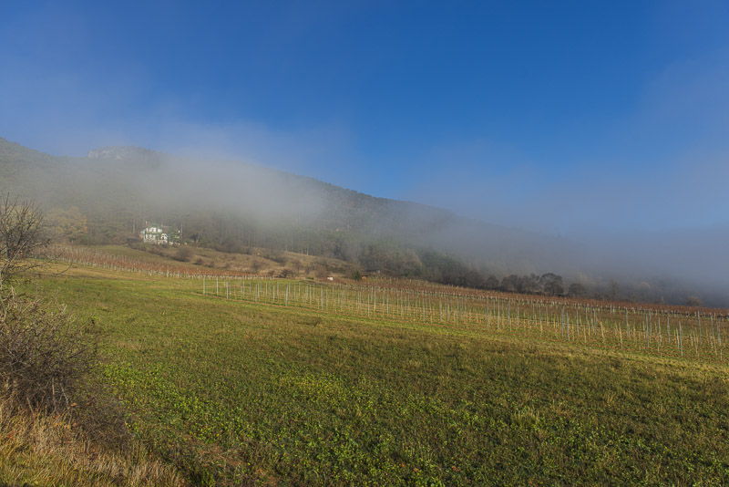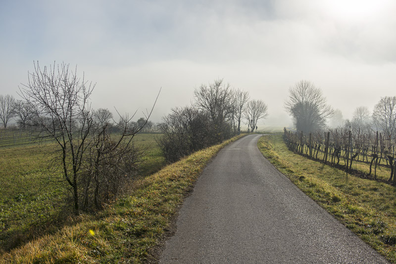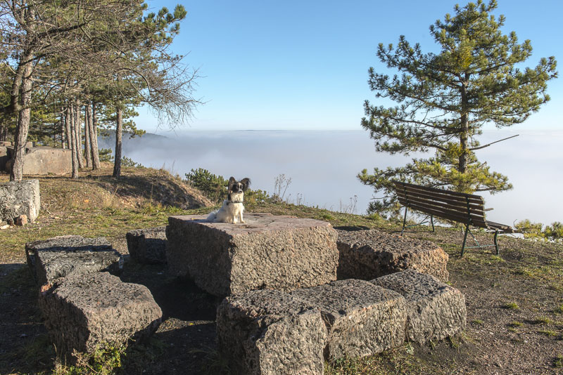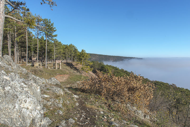 Bright sunshine in the morning, but at 9:30 Uhr, the view to the direection of Wiener Neustadt shows ground fog in the distance. I start at about 10 a.m. with the car for a short drive to climb Kienberg. When I turn to the left near Winzendorf´s school, I can see first wafts of mist approaching the big quarry and change plan immediately. Within less than a second, I change plan and bend to the right heading for the outskirts of Winzendorf. Sun and mist can make up for stunning views., and I hope to keep above the mist on the ridge of the Fischauer mountains.