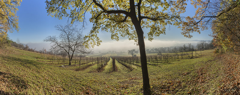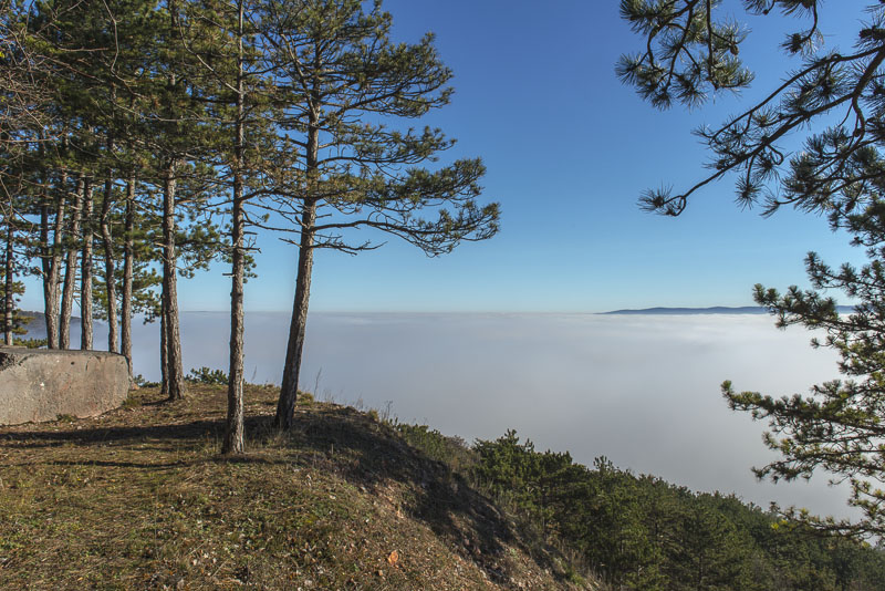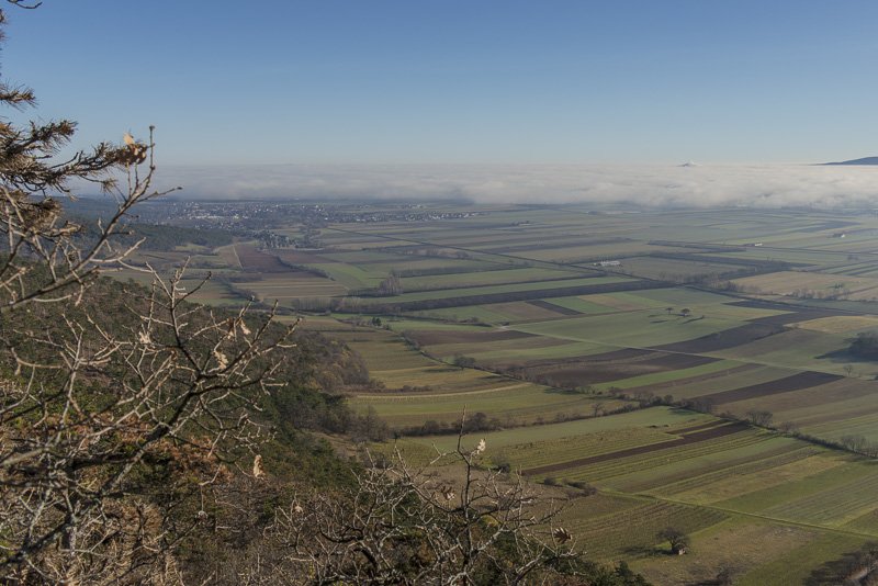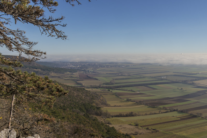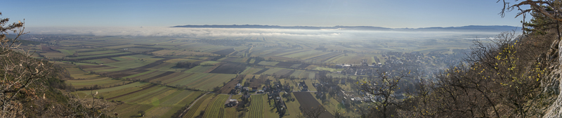 Another panoramic view of the Steinfeld ("Stone field"), as seen from a prominent rock on Schlossberg.To the left is Bad Fischau, in the centre is Weikersdorf, Winzendorf to the right. Behind the bank of mist are the Rosalia mountains. Click here or into the picture for a larger display.
