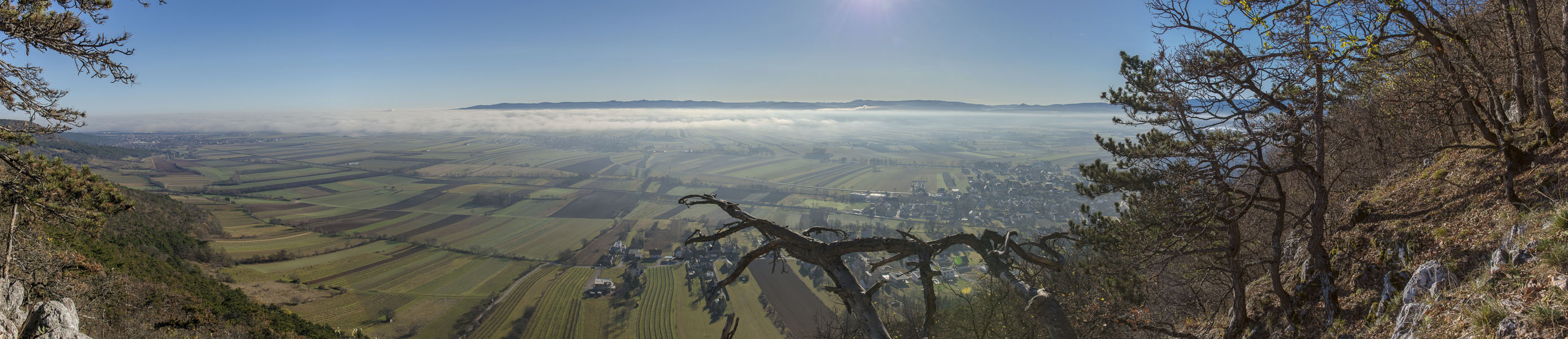 Panoramabild des Steinfelds, von einem markanten Felsen am Schlossberg aus gesehen. Links Bad Fischau, in der Mitte Weikersdorf, rechts Winzendorf. Hinter der Nebelbank das Rosaliengebirge.