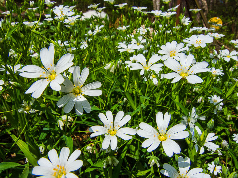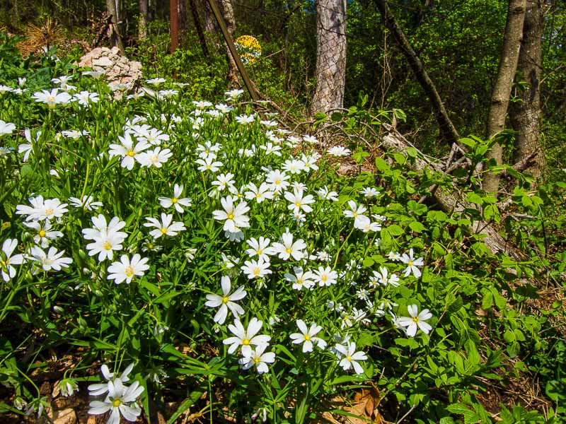 Im Wald wachsen Große Sternmieren (Stellaria holostea).