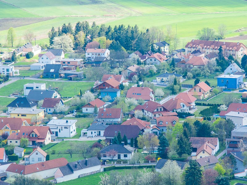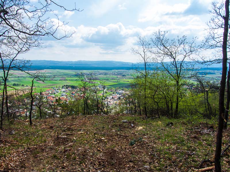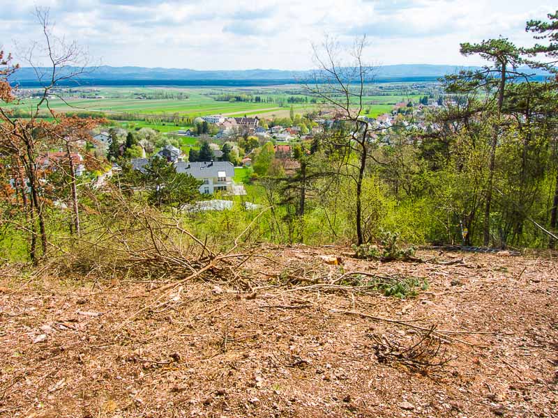 Vom oberen Rand des Steinbruchs schaue ich hinunter nach Winzendorf. Durch das Dachflächenfenster meines Badezimmers könnte man mich jetzt leicht sehen.