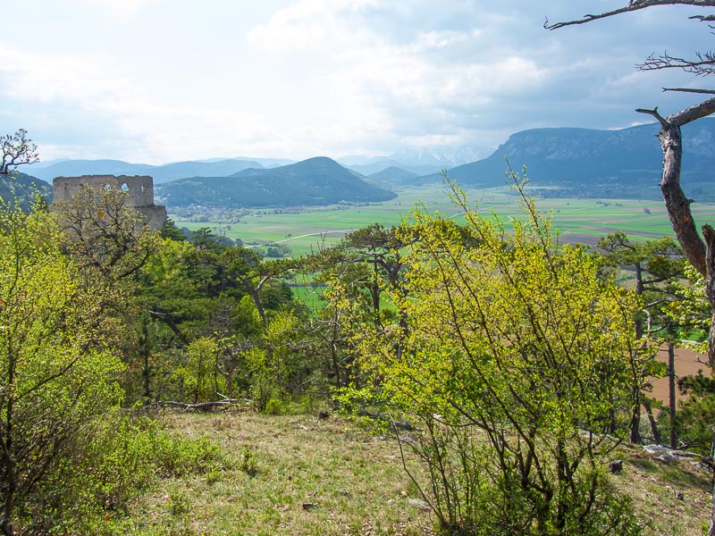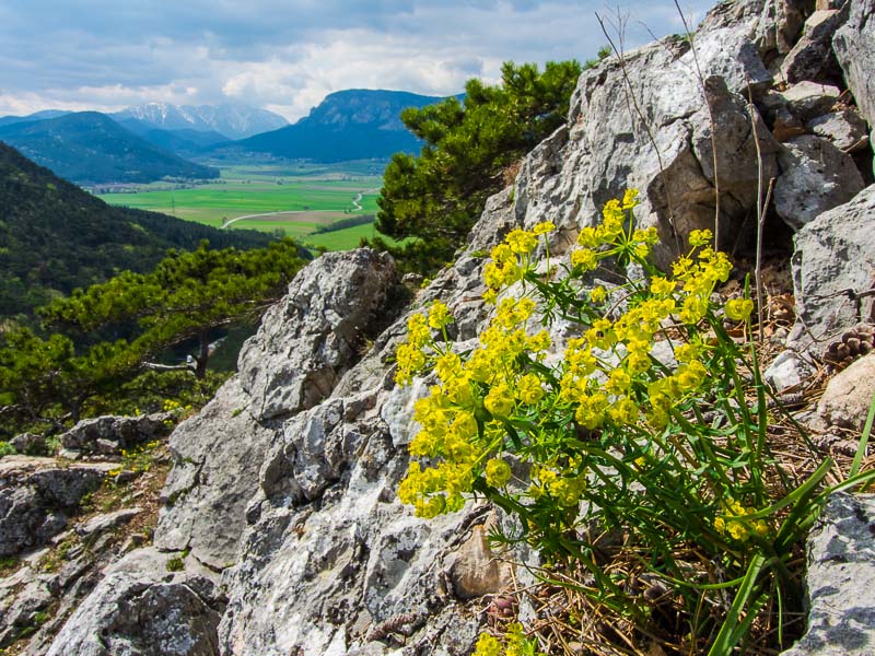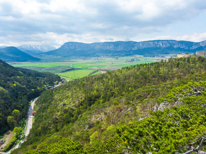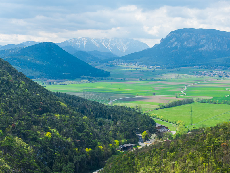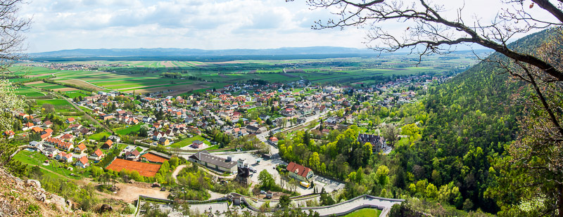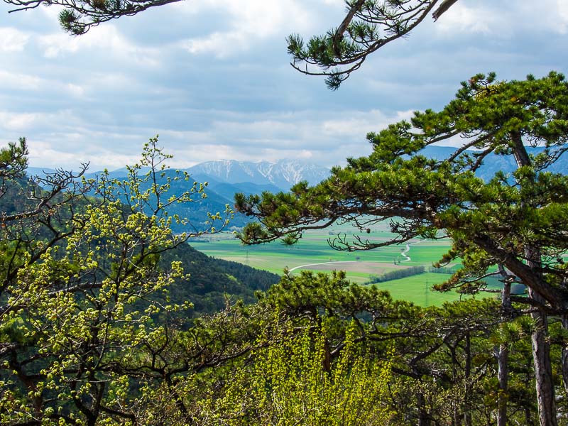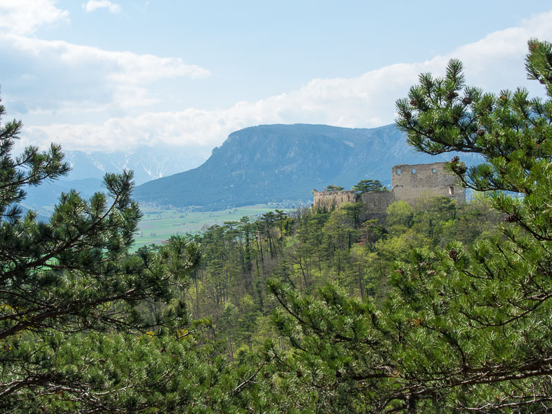 Noch ein kleines Stück oberhalb am Schlossberg - mein Lieblingsblick auf die Ruine Emmerberg und die Neue Welt mit dem Schneeberg und der Hohen Wand.