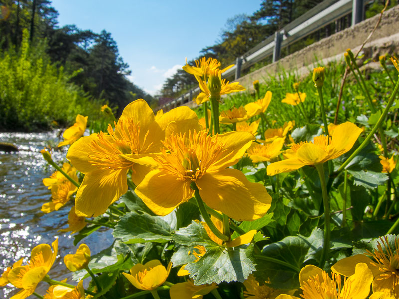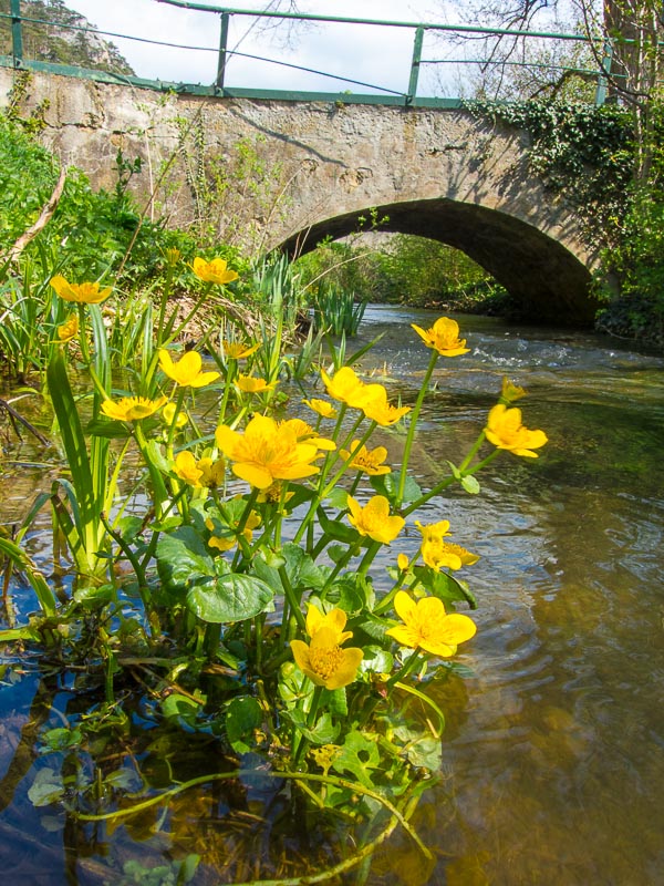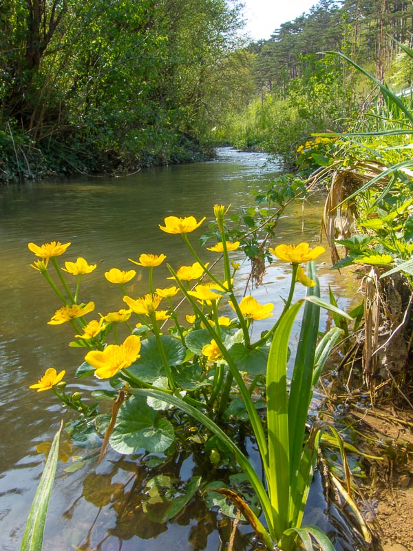 Ich wandere entlang des Prosset Baches zurück. Hier blühen reichlich Sumpfdotterblumen (Caltha palustris).