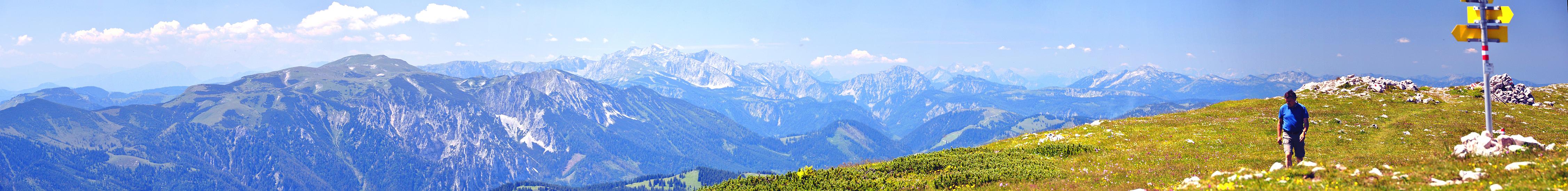 Westliches Zoom - Panorama vom Gipfel des Windberges (1.903 m, Schneealpe). Links im Vordergrund die Veitsch, danach das Hochschwabmassiv, gefolgt von den Niederen Tauern im Hintergrund, davor rechts der Lugauer. Es folgen die restlichen Gesäuseberge dann ganz im Dunst das Dachsteinmassiv gerade erahnbar.