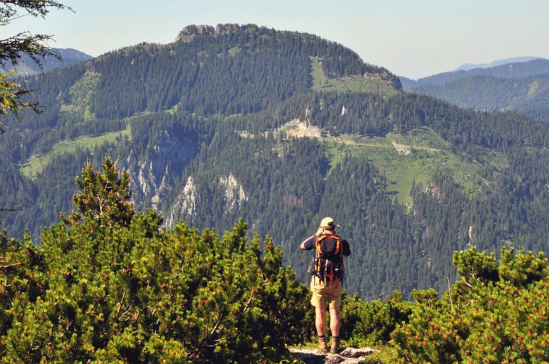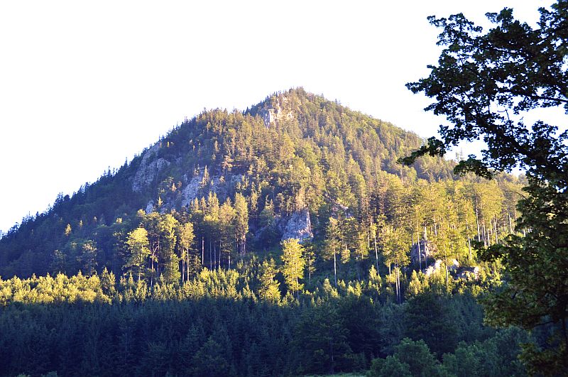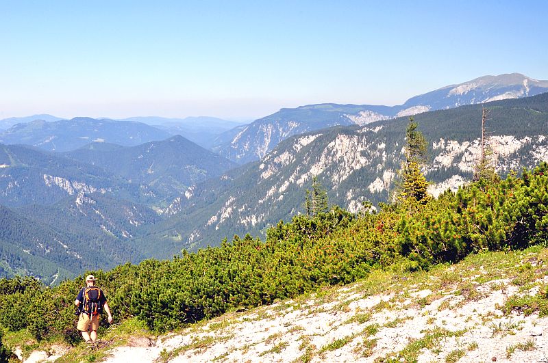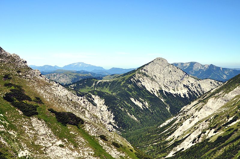 Jetzt weitet sich der Blick, und der Ötscher (1.893 m) wird links im Hintergrund sichtbar. Rechts hinter der Donnerwand der Göller (1766 m).