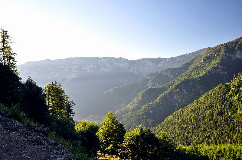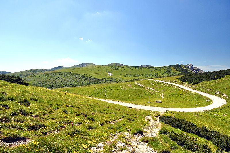 Blick zurück - so hoch sind wir schon wieder? - die Rax im Hintergrund.