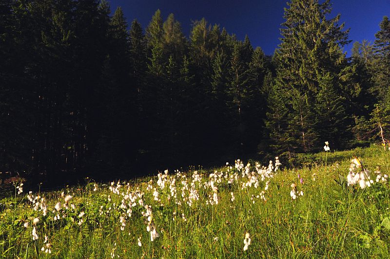 Bunte Blumenwiese - wir nähern uns dem Talgrund. Nach dem feuchtkalten Frühjahrswetter sind die Lerchen hier heroben noch hellgrün.