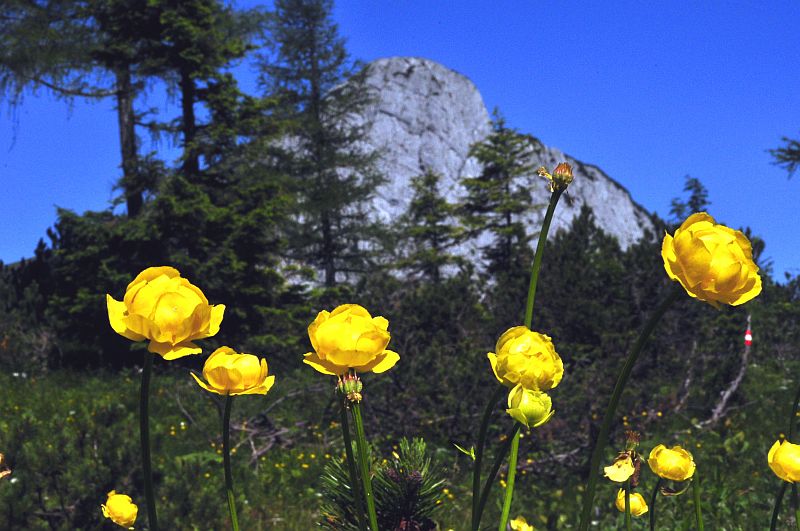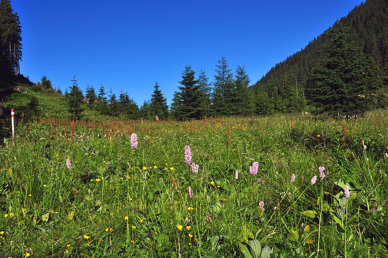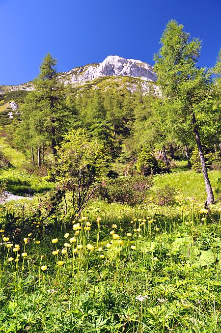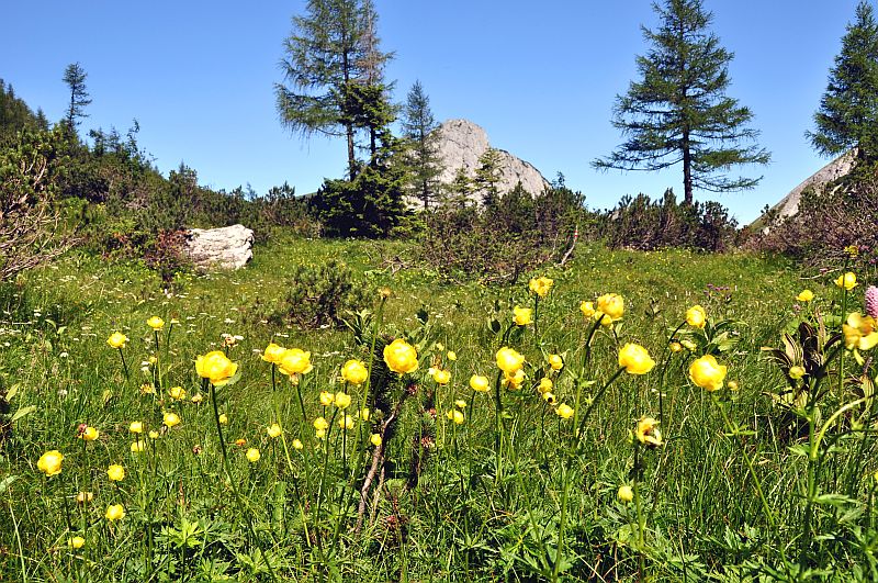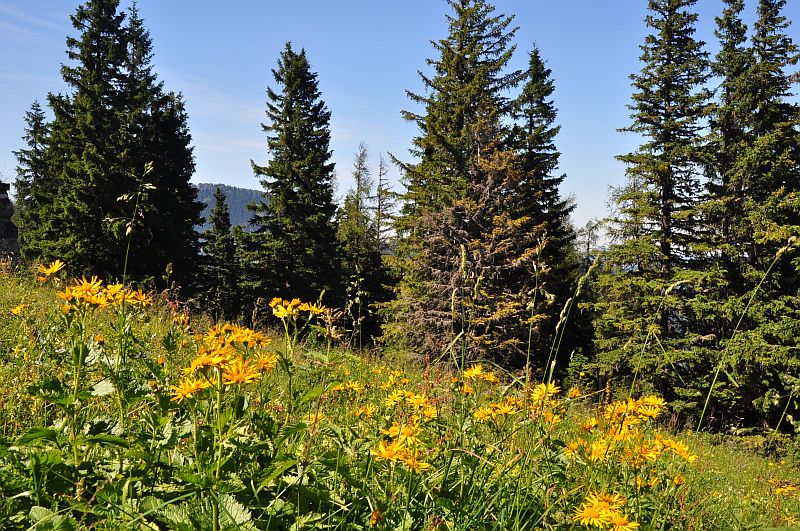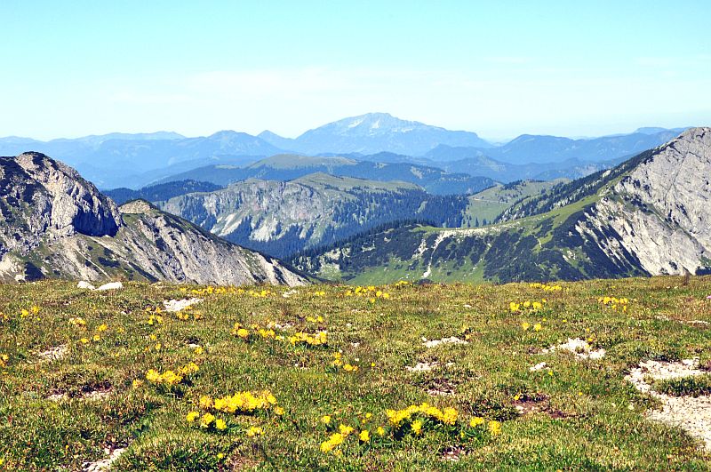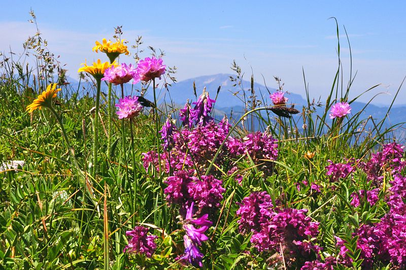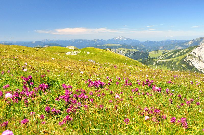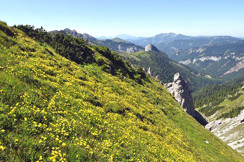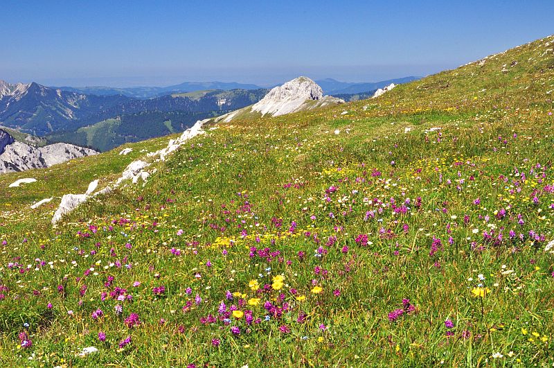 Blumenwiesen am sanften Abhang Richtung Nordwesten - im Hintergrund der Ötscher.