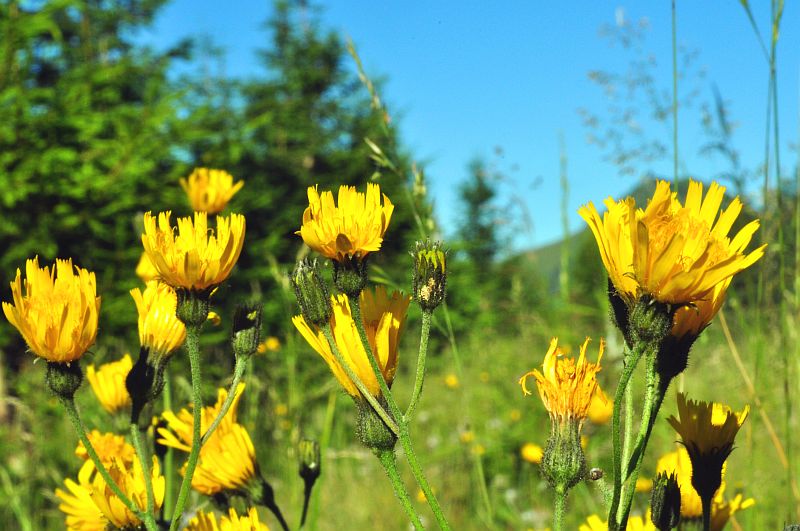 Doldiges Habichtskraut (Hieracium umbellatum) in großer Gruppe.