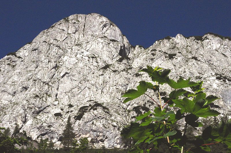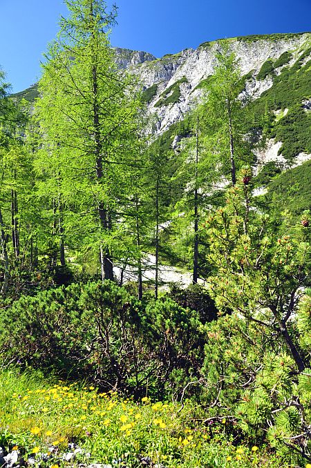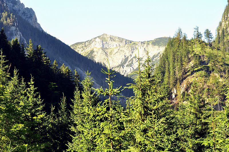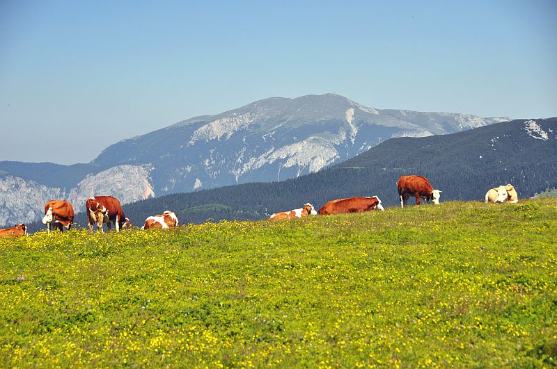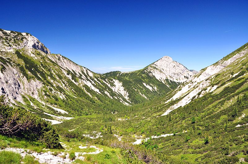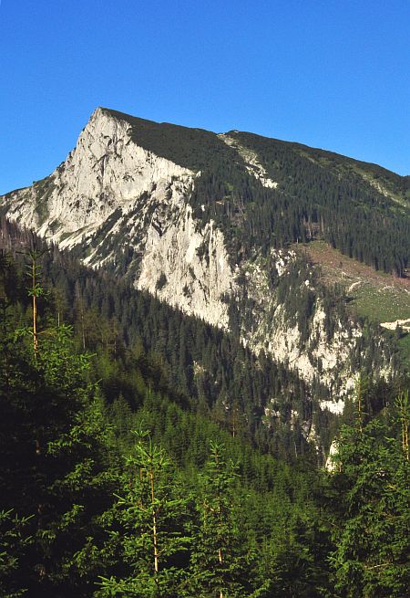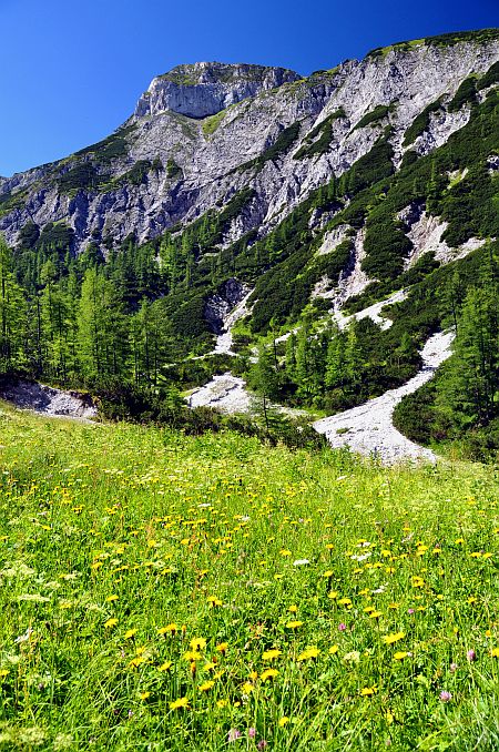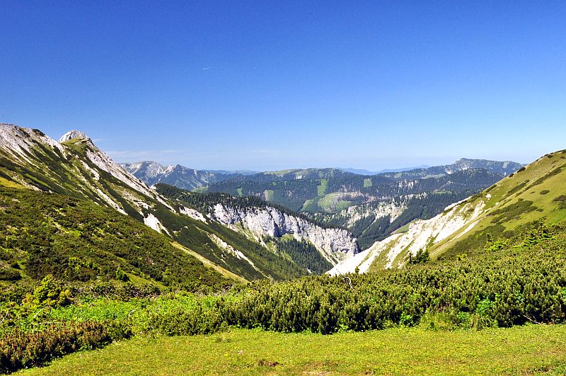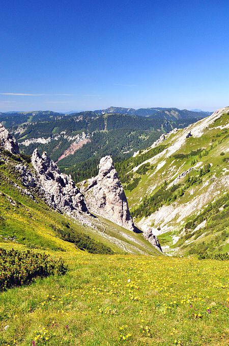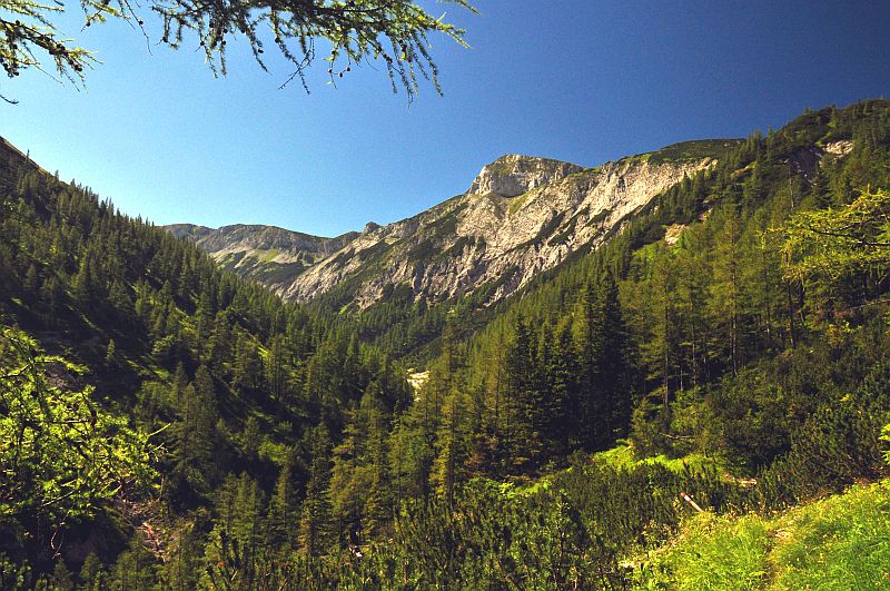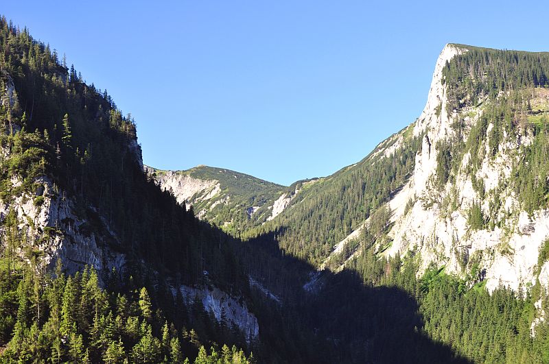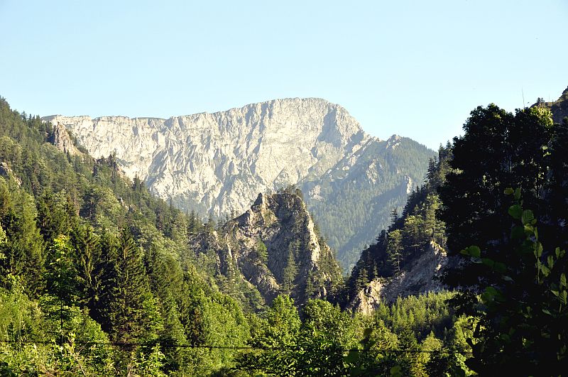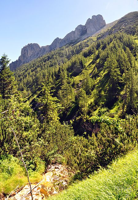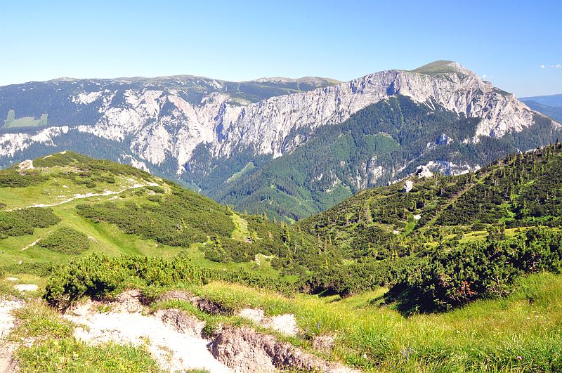 Wir sind nun wieder unterwegs bergab ins Tal der Kalten Mürz. Ein Blick nach links enthüllt die Donnerwand (1.799 m) - das Tal davor wird unsere weitere Route.
