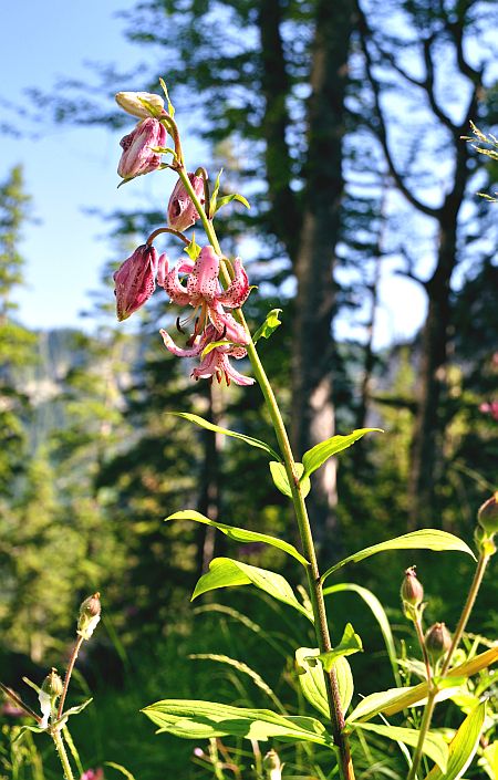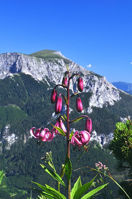 Türkenbund (Lilium martagon), dahinter die Rax mit der Heukuppe (2.007 m)