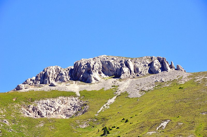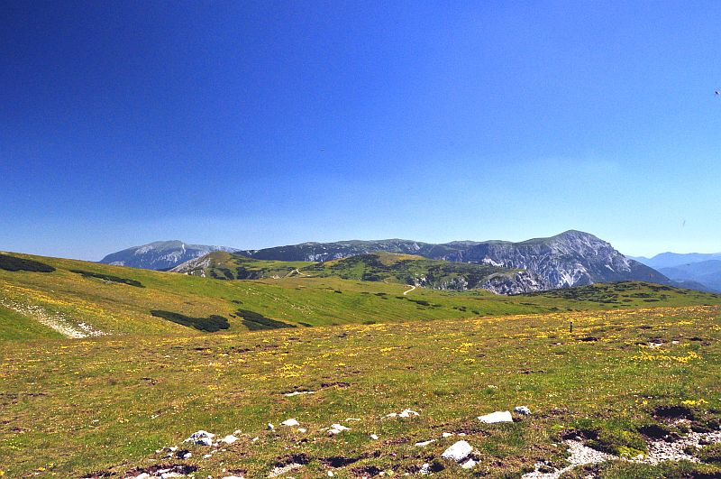 Der Windberg über dem Schneealpenplateau. Stellenweise sind die Wiesen bereits aus der Ferne erkennbar gelb - durch Unmengen an Alpen - Wundklee (siehe weiter oben).