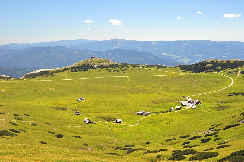 Blick vom Windberg über das Schneealpenplateau zum Schneealpenhaus (auf dem H+gel im Hintergrund), auf der Wiese davor die Michlbauernhütte. Dahinter am Horizont die Schipisten des Stuhlecks.
