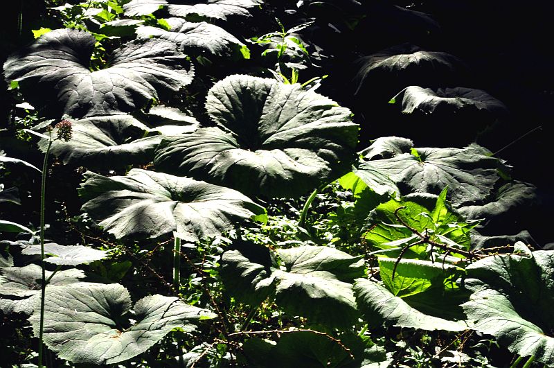 Im extremen Streiflicht im Wald leuchten die riesigen Blätter des Grauen Alpendosts (Adenostyles alliariae)