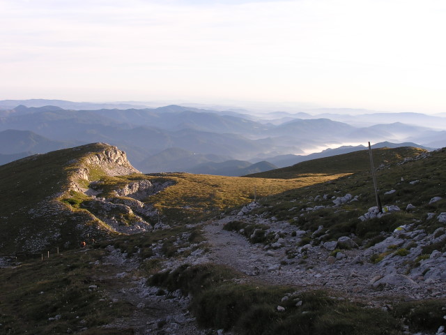 Oberhalb des Ausstiegs am Schneebergplateau. Am Horizont rechts die Hohen Wand, davor die Dürre Wand