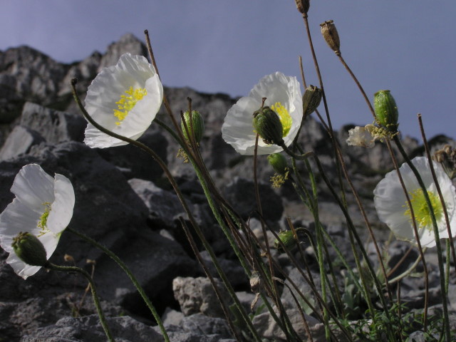 Weisser Alpenmohn am Abstieg im Geröll des Fadensteigs