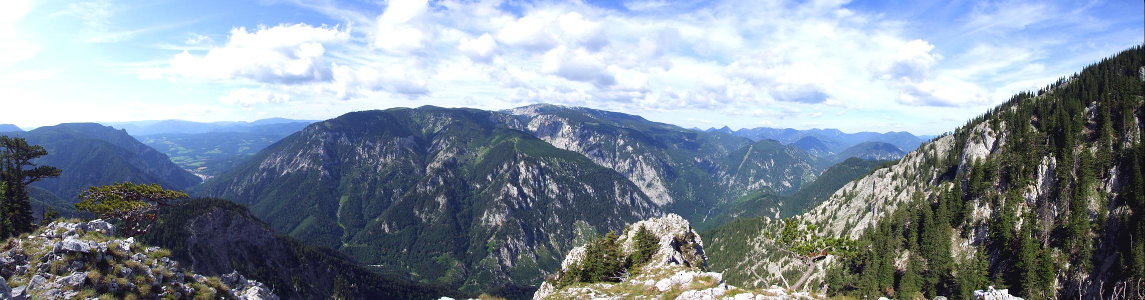 Südliches Panorama vom Gipfel der Stadelwand (1.407 m). Dominierend der Blick zur Rax. Ganz links der Mittagsstein.
