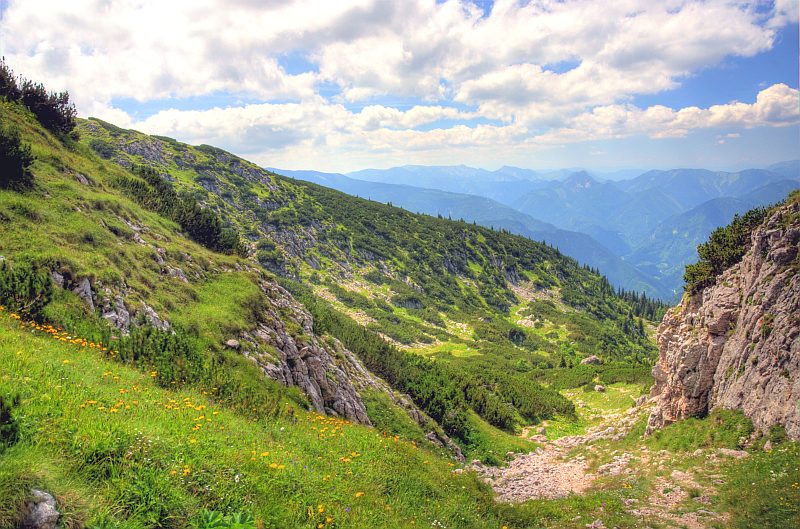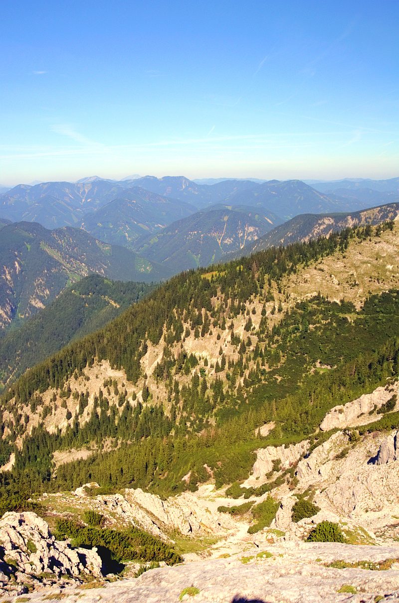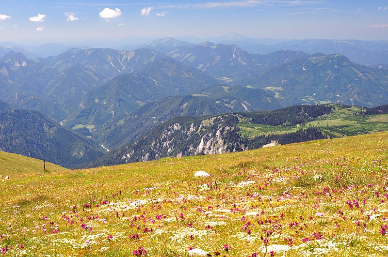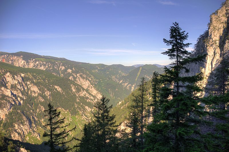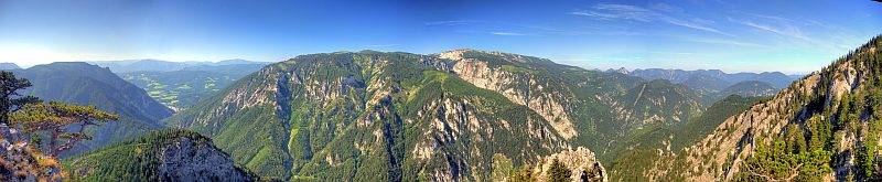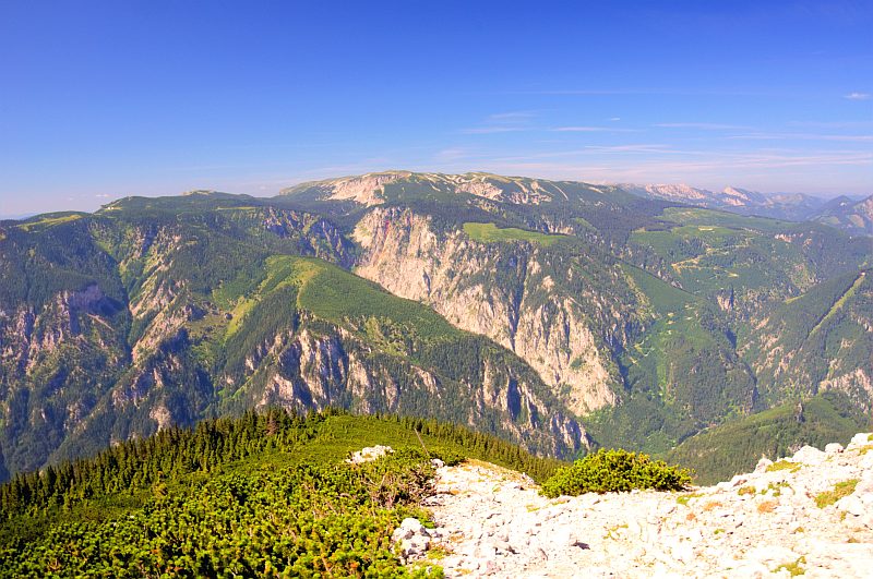 Vom "Gipfel" der Stadelwand hat man schon einen herrlichen Panoramablick auf das Höllental und die Rax hat. Hierher oder ins Bild klicken für eine größere Darstellung.