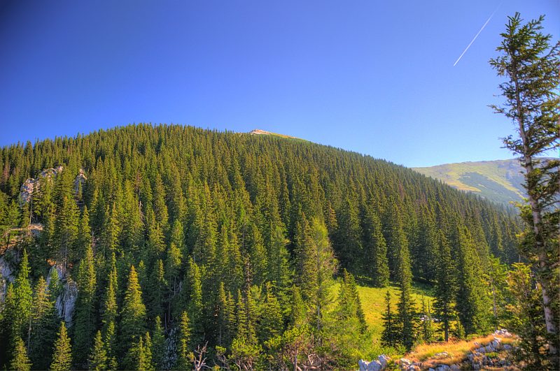 Durch steilen Wald sind wir nun rechts der Stadelwand aufgestiegen und finden uns auf einer kleinen Wiese beim Forsthaus oberhalb der Wand wieder, auf dem kleinen Felszacken der Stadelwand, in 1.300 m Seehöhe. Die Hälfte der 1.550 m Aufstieg sind geschafft.