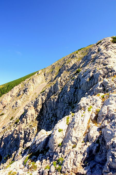 Wir wandern jetzt durch Schutt bergauf, links davon beeindruckende Felsabstürze.