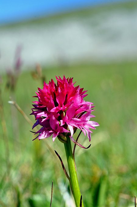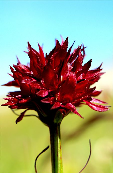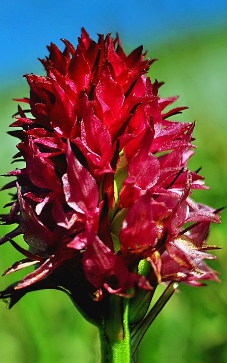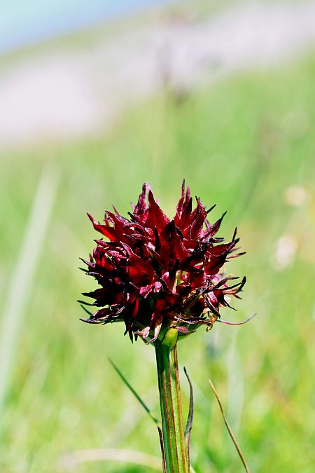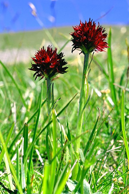 Verschiedene Farbvarianten des Kohlröserls (Nigritella nigra), einer weiteren Orchideenart.