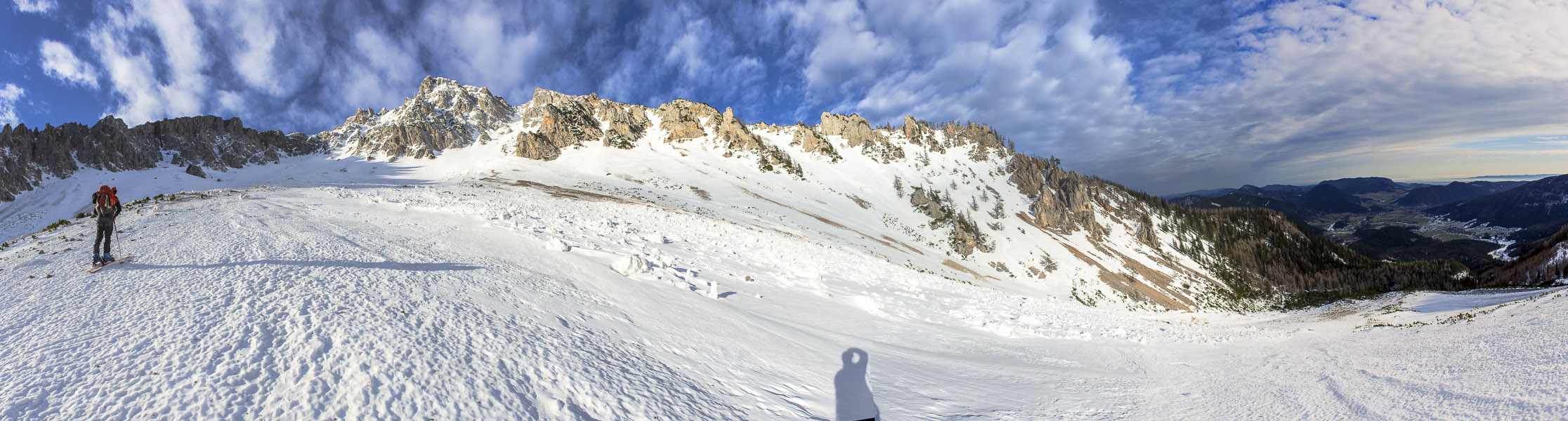 Panoramabild der Breiten Ries: ganz links die Rieswände, dann Kaiserstein, Festenkogel und Nandlgrat, rechts Puchberg, im Hintergrund die Hohe Wand.