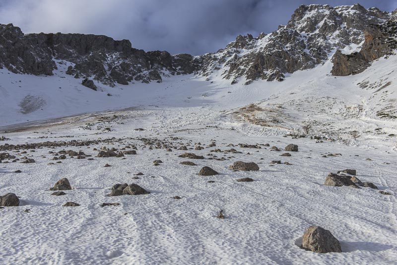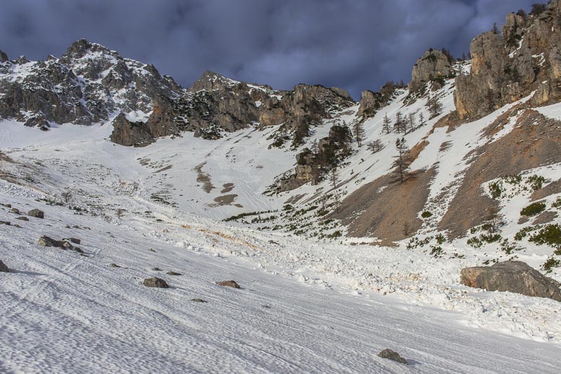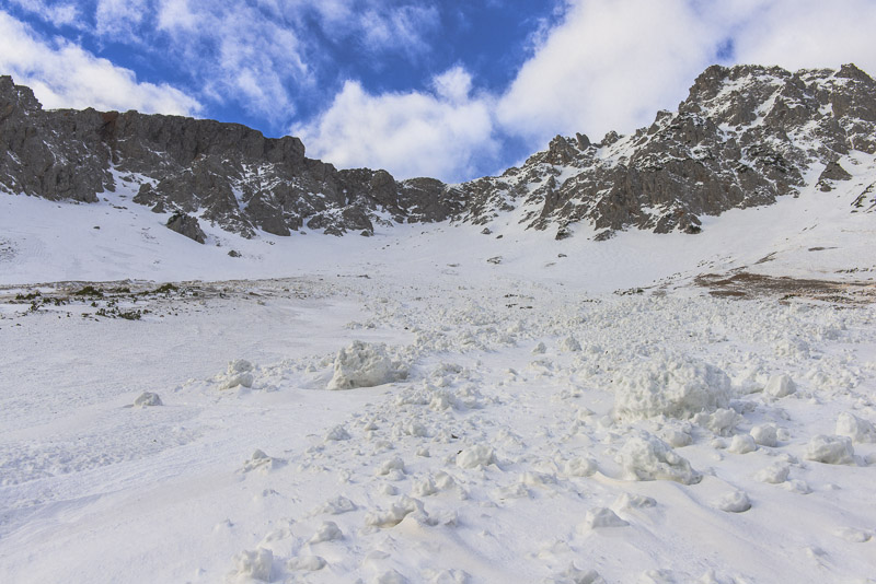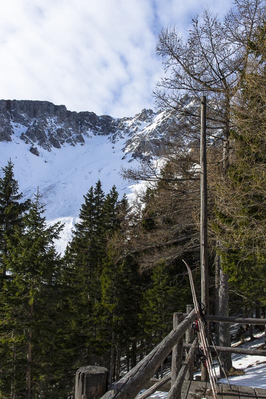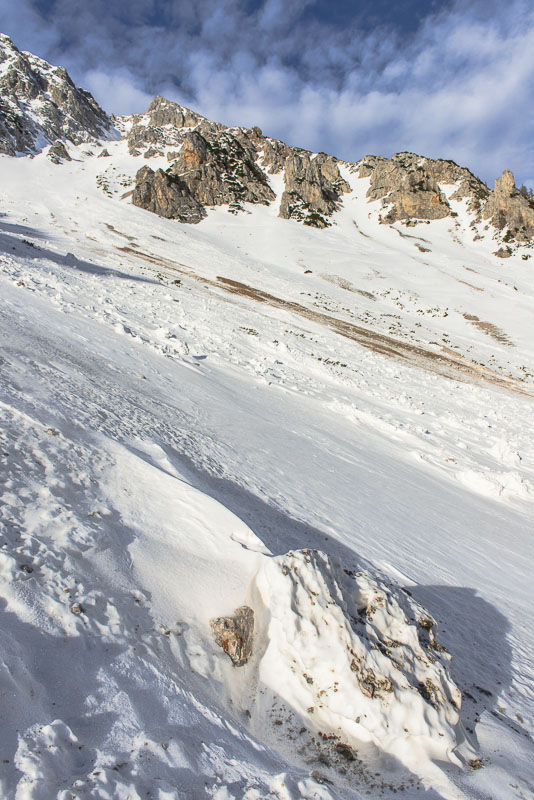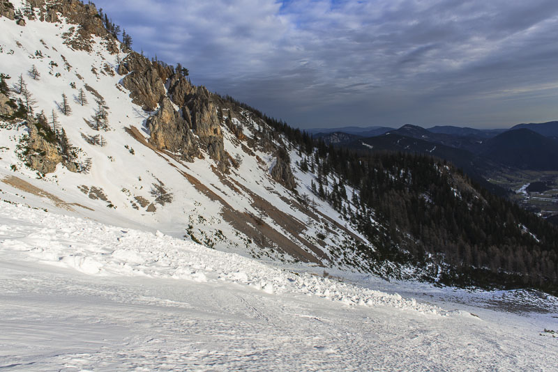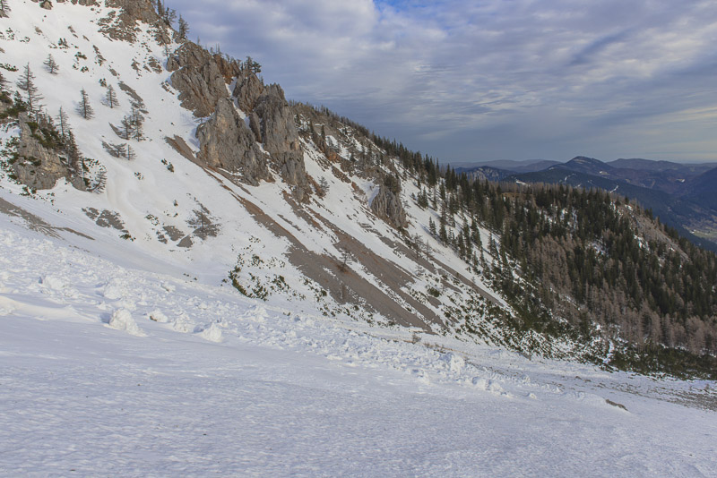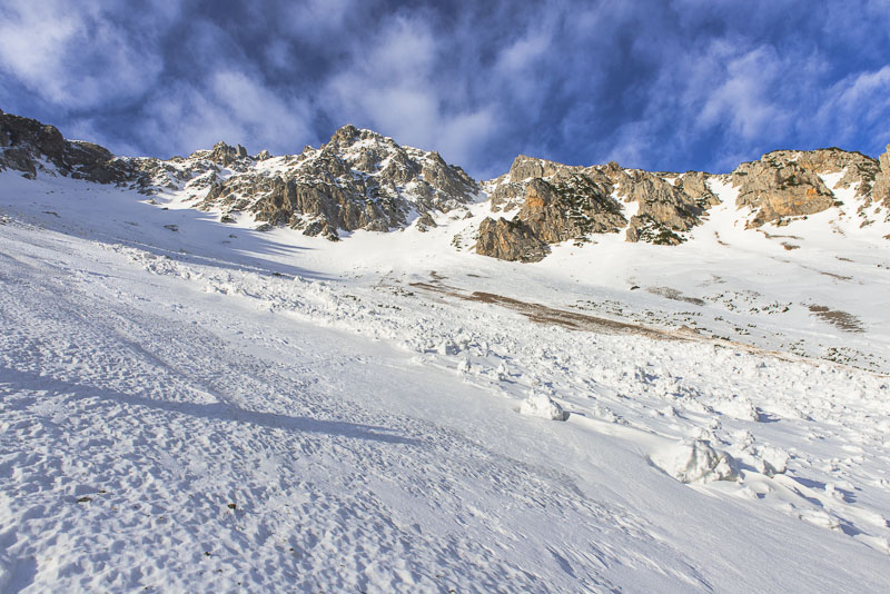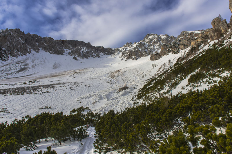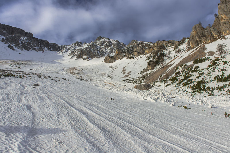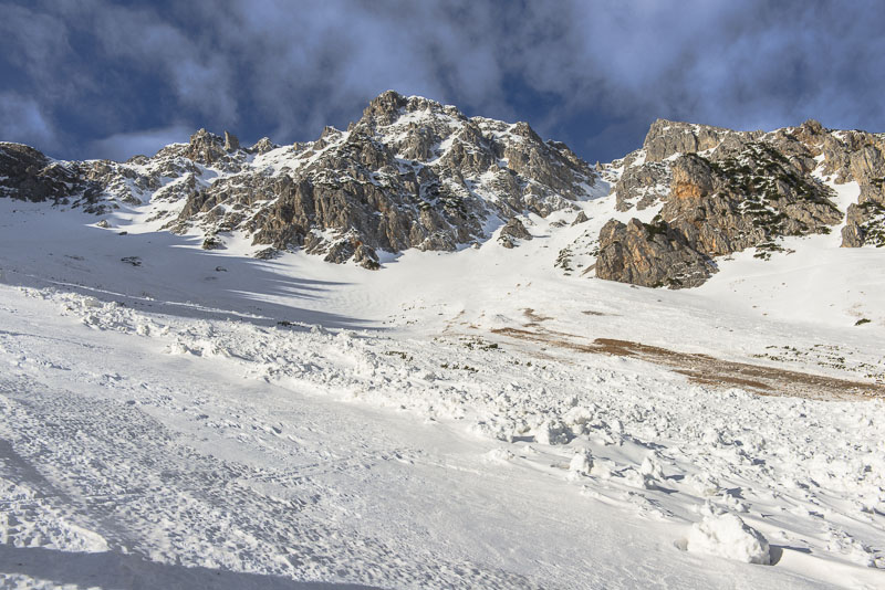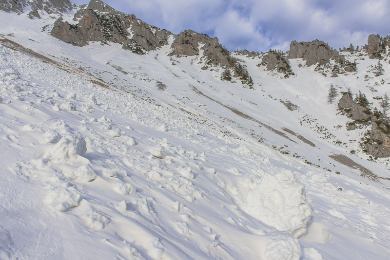 Hier sind einige Lawinen abgegangen. Zunächst hat es sehr viel geschneit auf schneefreien Untergrund - keine Verbindung. Resultat: die erste große Lawine. Danach hat tagelanger starker Wind an der Kante oben riesige Schneewechten aufgehäuft. Auch die sind dann noch als Lawinen herunter gekommen. Da Koarl aber auch Informationslieferant für den Lawinenwarndienst ist und sich gut auskennt, kann ich auf ihn vertrauen, dass uns nichts passiert. Es ist auch noch zu früh am Tag, und alles ist gefroren.