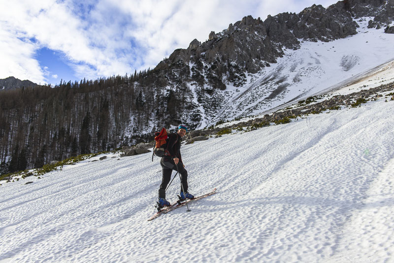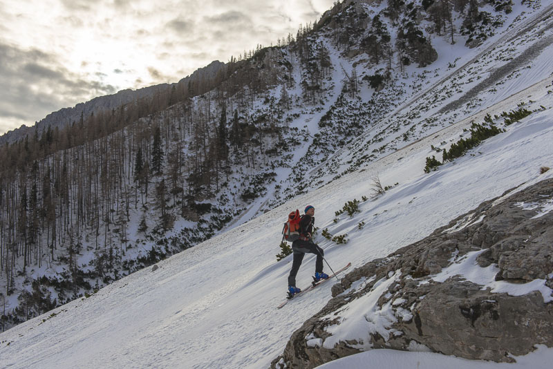 Die Schneepackeln auf Koarls Fellen sind hier eindeutig ein Vorteil - ich muss mit meinen noch fast neuen Fellen in Serpentinen gehen, während er die direkte Aufstiegsroute wählen kann.