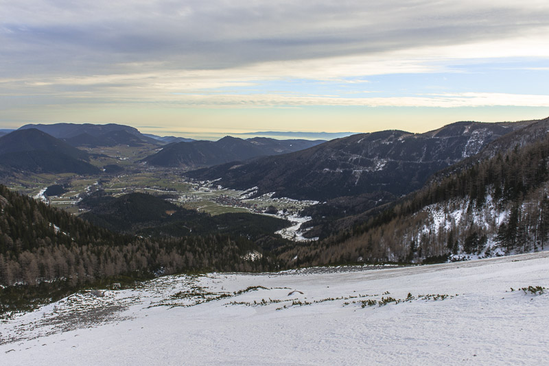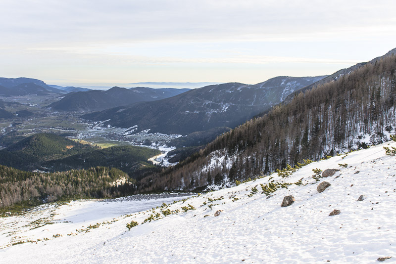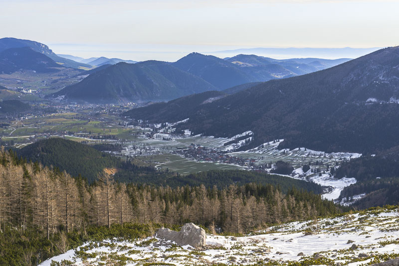 ... mit dem Schneebergdörfl im Vordergrund. Eine Dunstschichte liegt über dem Wiener Becken.