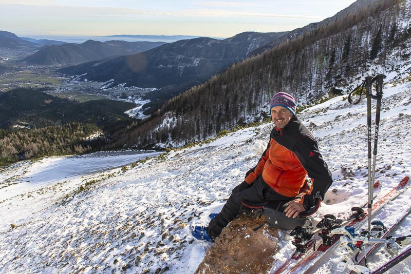 Kleine Rast am höchsten Punkt, Felle und Kamera in den Rucksack, und wir schnallen die Schi an und fahren ab.