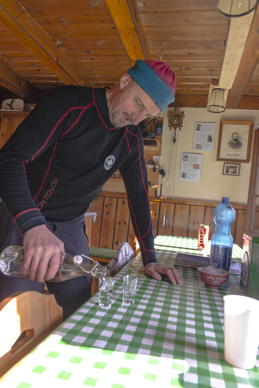 Ein bisschen sieht man von hier auch zur Breiten Ries. Koarl heizt den Ofen ein, schenkt uns ein Schnapserl ein, und es gibt Bratwürstl. Vielen Dank, Koarl, für die Einladung!