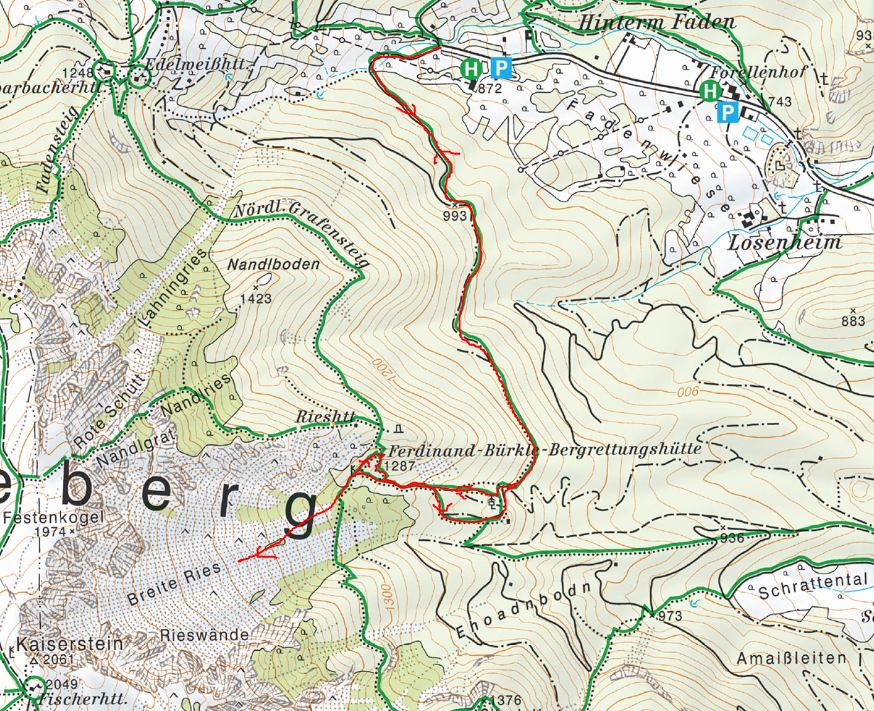 Bis zum Kaiserstein ist es von hier noch weit. Mit Schiern hier bis zum Gipfel zu gehen wäre aber sowieso kaum möglich, ganz oben ist es fast 45 Grad steil. Am oberen Ende dieses noch glatten Schneebandes kehren wir daher um und fahren wieder ab.