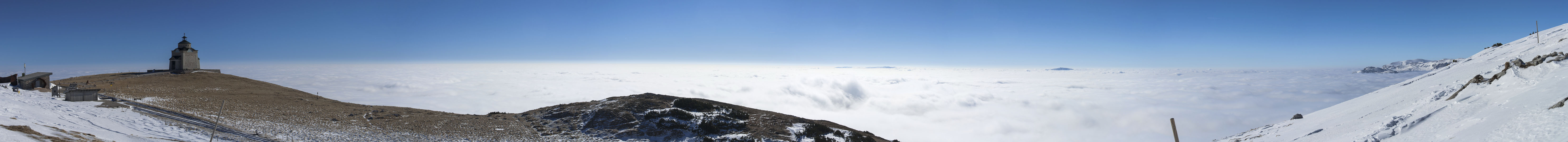 Pause Lunch with a panoramic view over the church and the sea of clouds, far right is the Rax massive.