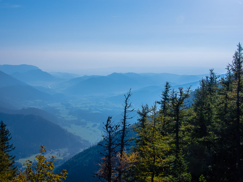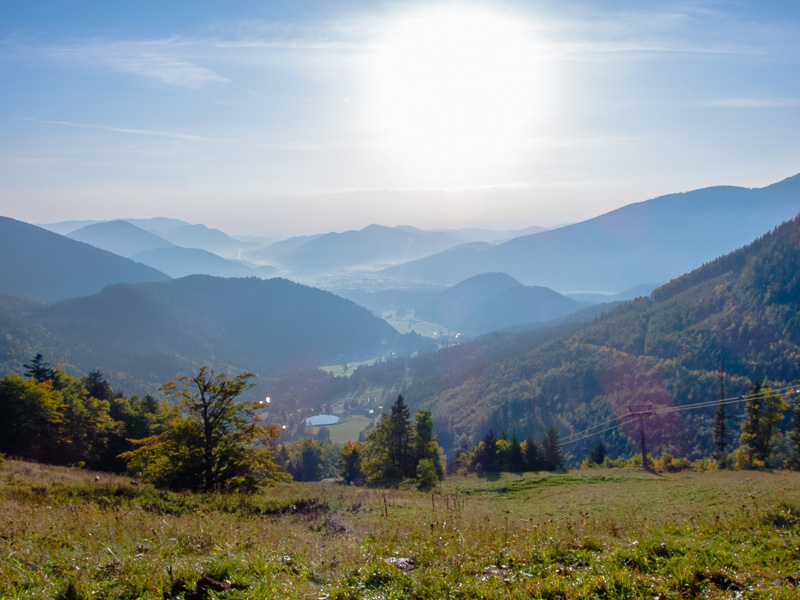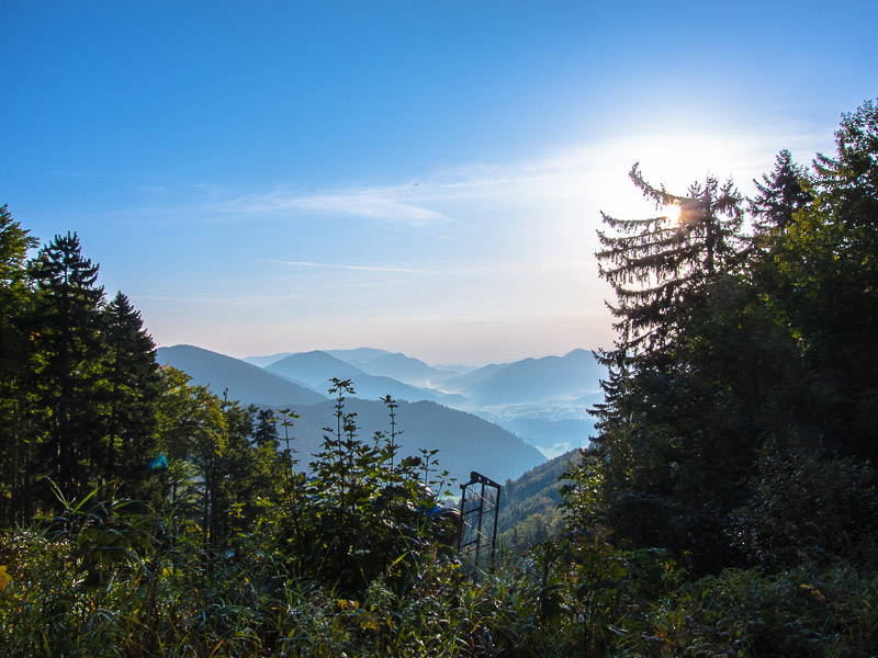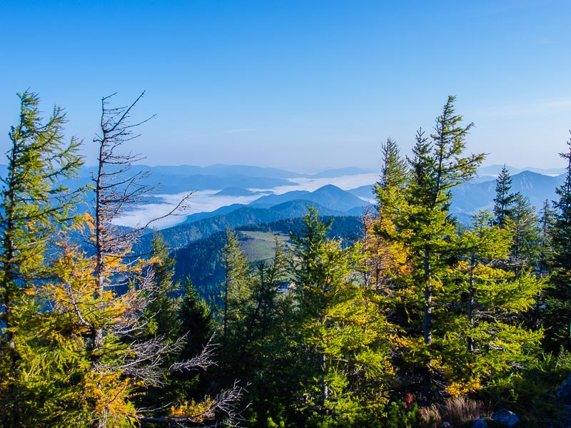 We have left the forest - a first view over the mist-covered Piesting valley.