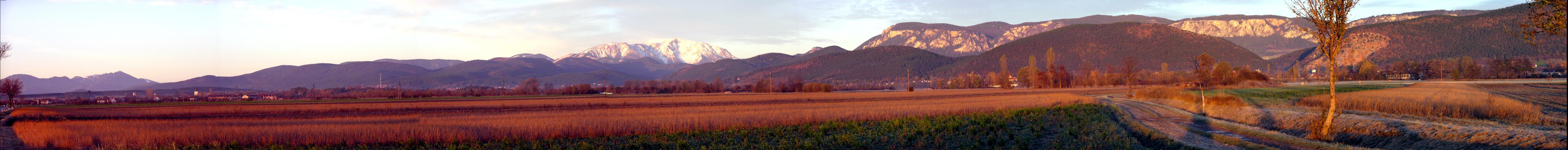 Panorama in südwestlicher bis nordwestlicher Richtung, von nahe Weikersdorf aus. Ganz links der Semmering mit dem markanten Sonnwendstein, dann der Schnneberg, anschließend die Hohe Wand. Vor der Hohen Wand, von links nach rechts, Kienberg, Mitterberg, Prosset Schlucht und Winzendorf mit dem Kalksteinbruch dahinter.
