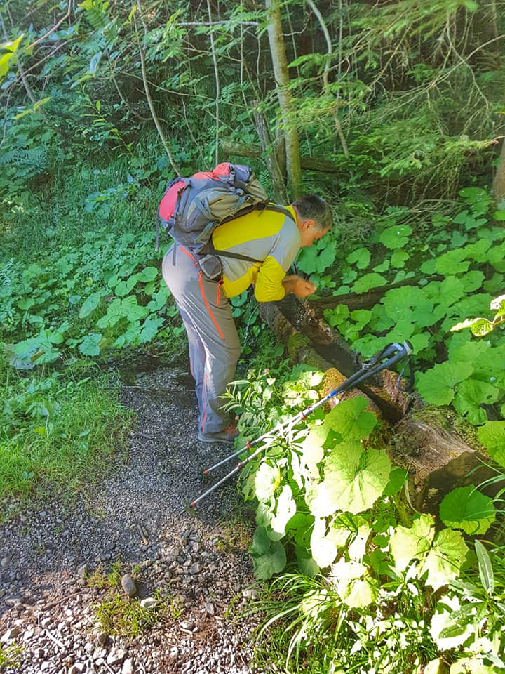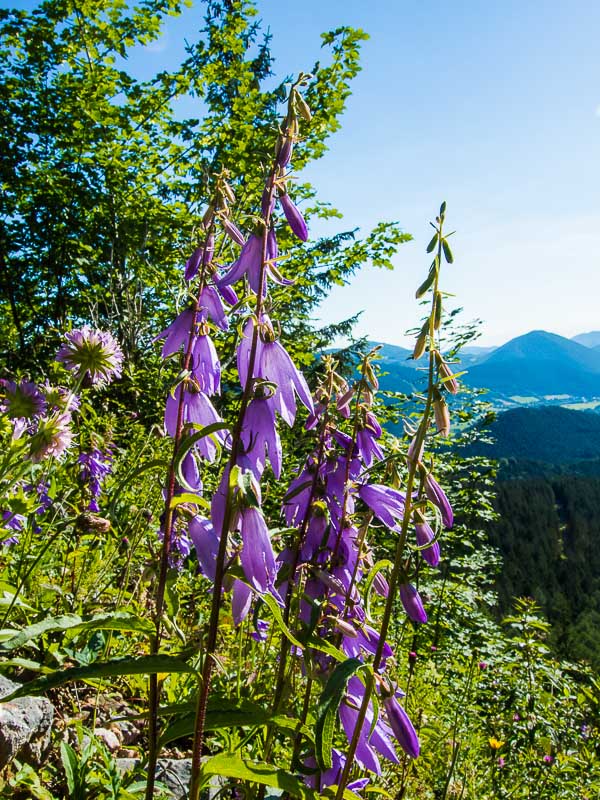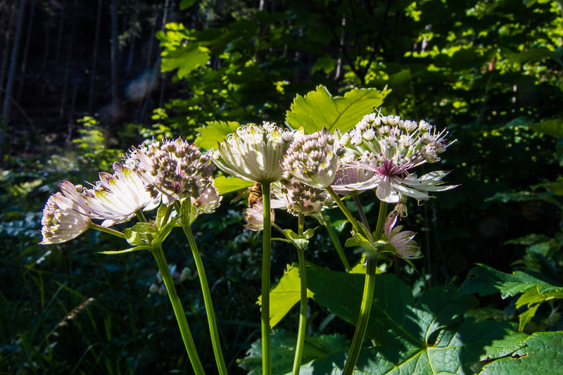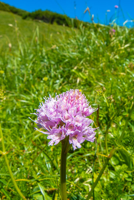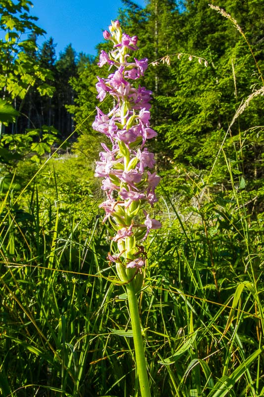 First we walk up through steep forest. On clearings, we find some fragrant orchids (Gymnadenia conopsea).