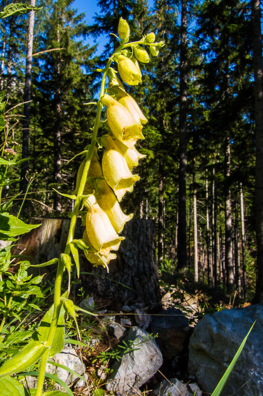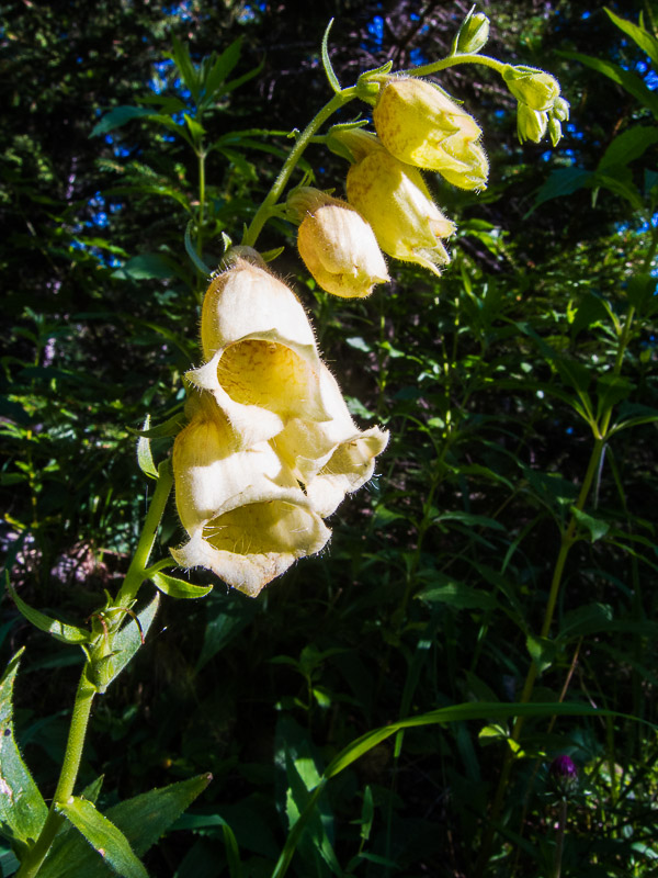 Lots of big-flowered yellow foxgloves (Digitalis grandiflora) inside the forest.