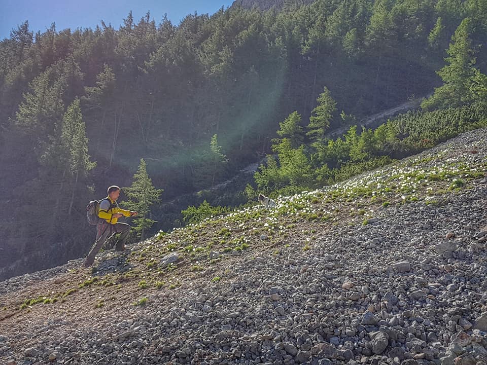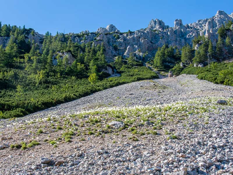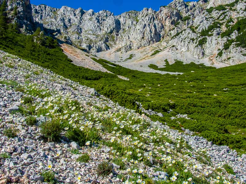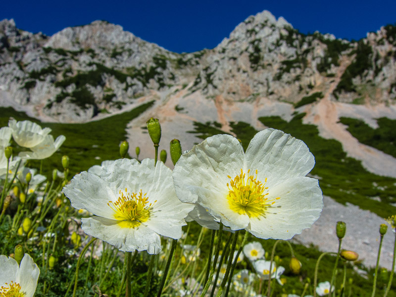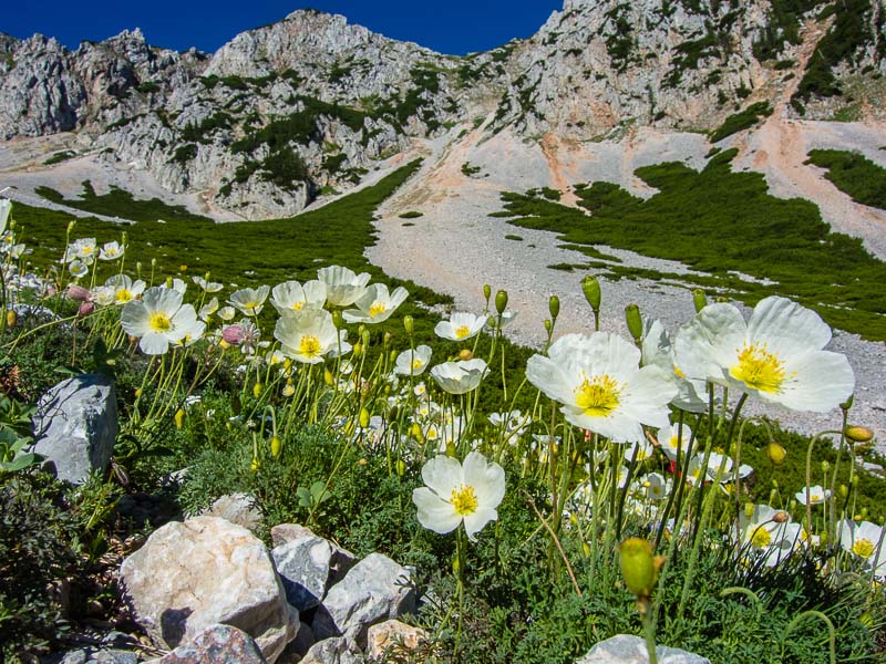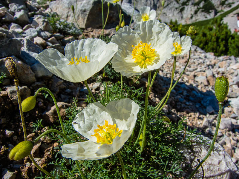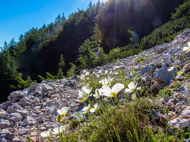 A circumscribed place, where the scree seems to be not as mobile as elsewhere, is covered with lots of Alpine poppies (Papaver alpinum).